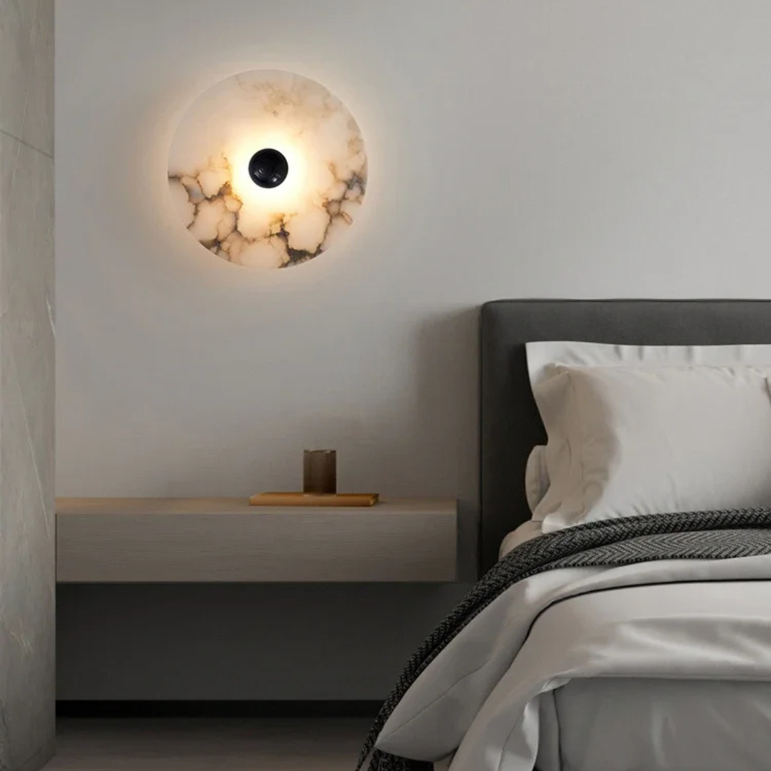 Die LumaStein Halo Wandleuchte vereint echte Marmoroptik mit einem sanften warmweißen Licht. Jede Leuchte ist durch das natürliche Muster des Marmors ein Unikat.