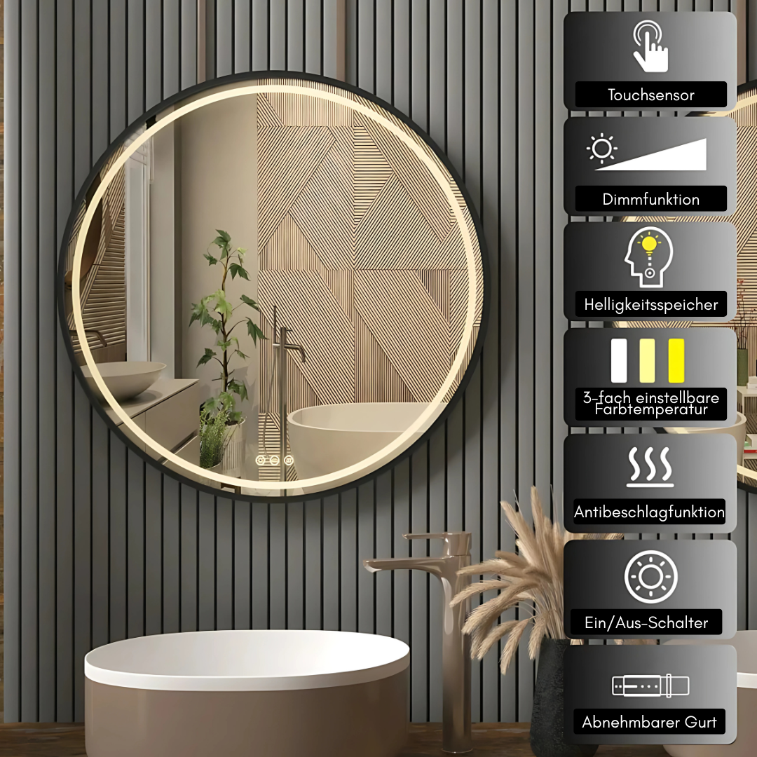 Der moderne runde LED-Spiegel mit edlem Goldrahmen bietet 3 Lichtfarben (warm, neutral, kalt) sowie eine komfortable Touchsteuerung.
